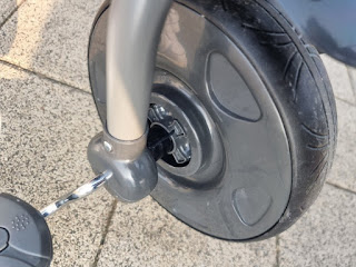 [이런 게 좀 아쉬워요] 1) 풋브레이크가 없는 점 2. 바퀴가 고무재질이 아닌 플라스틱 재질로 보도블록 주행시 소음이 조금 난다는 점